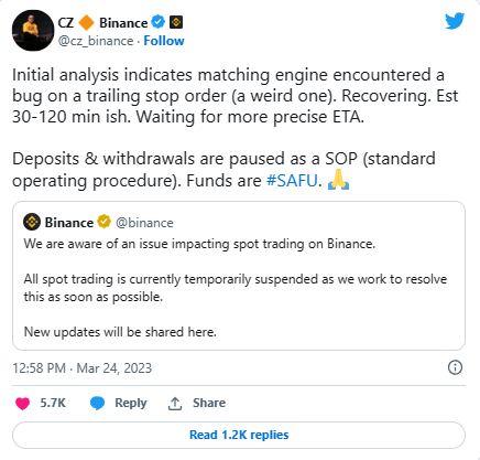 Spoločnosť Binance 24. marca dočasne pozastavila spotové obchodovanie, pravdepodobne kvôli problému, ktorý ovplyvnil jej párovací mechanizmus. Podľa nedávnej aktualizácie na oficiálnom účte Binance na Twitteri sa zdá, že problém súvisí s chybou v príkaze trailing stop. Všetko spotové obchodovanie je v súčasnosti dočasne pozastavené, pretože pracujeme na jeho čo najskoršom vyriešení.
